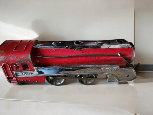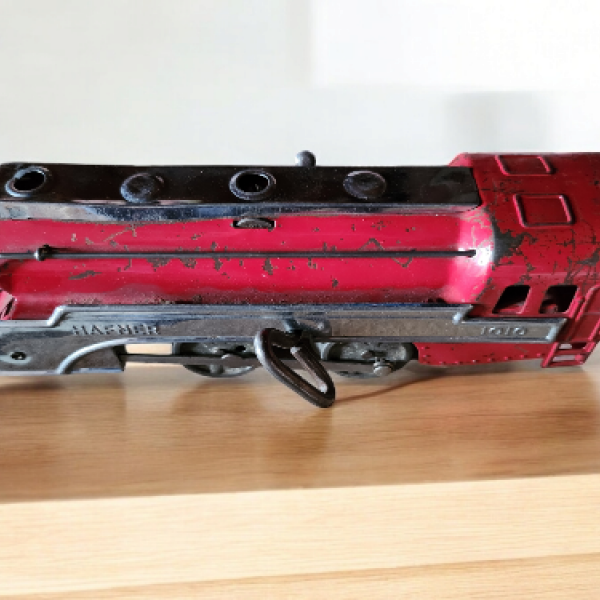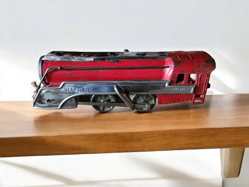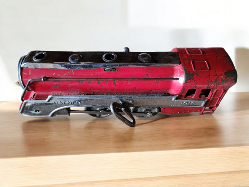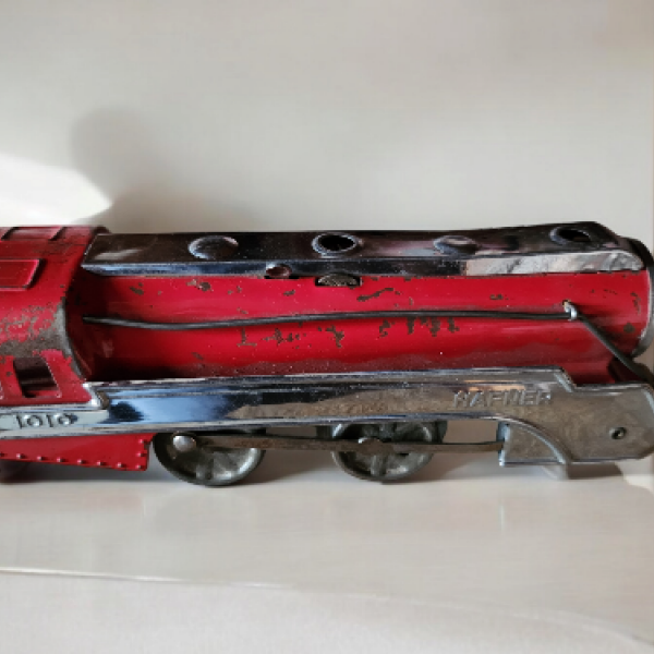 Train locomotive à remontage 1010 en étain HAFNER à jauge O des années 1930. Couleur rouge. Parfait état et complète avec sa clef d'origine