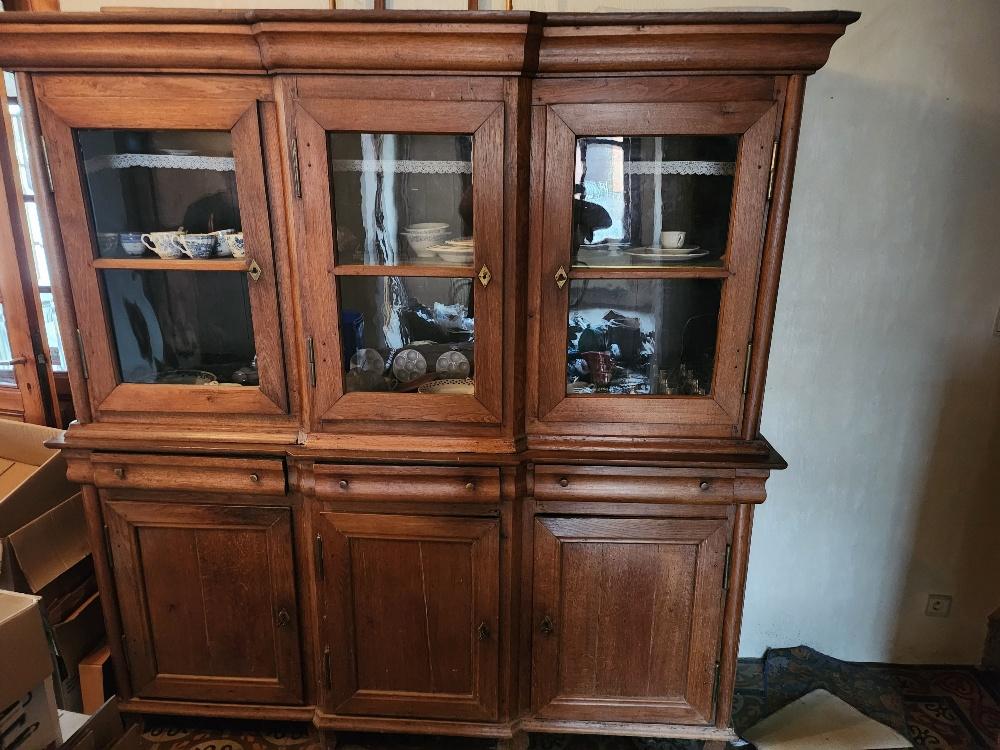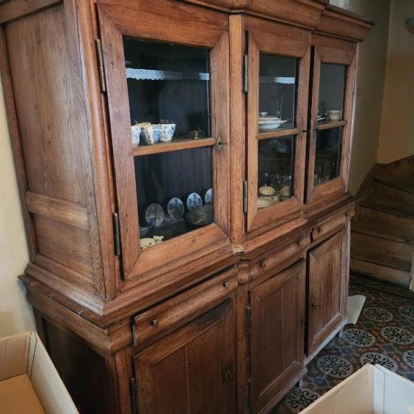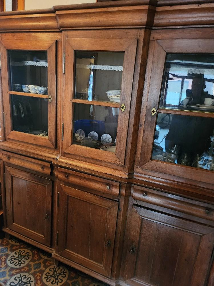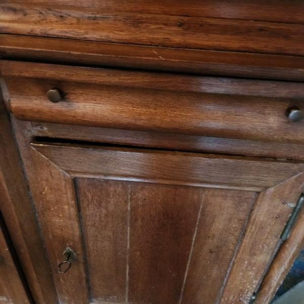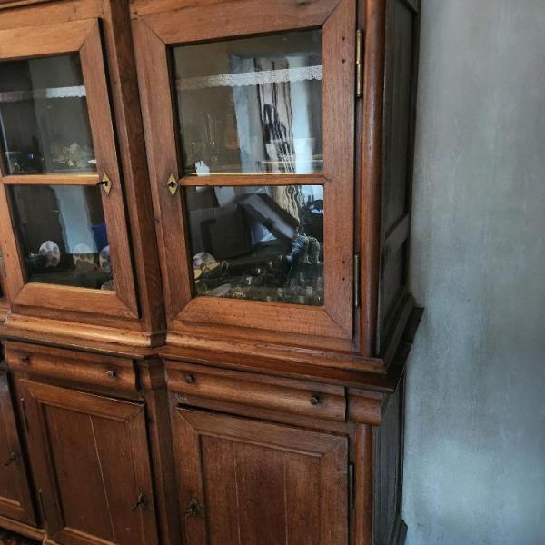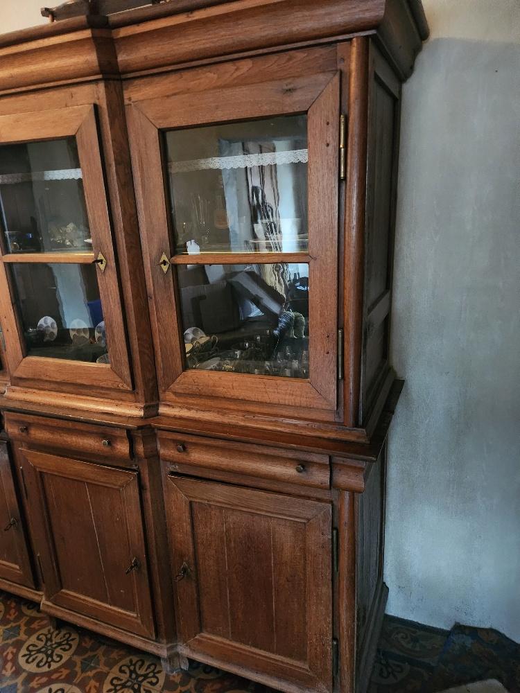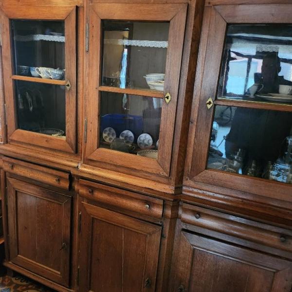 Deux corps en chêne massif Vitrines au dessus (3 portes) Commode en dessous (3 portes) les deux séparées par 3 tiroirs Dimensions : 205 (hauteur)x201x57 cm