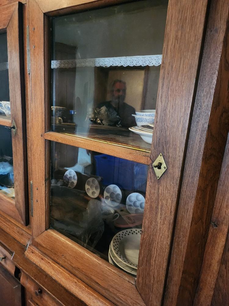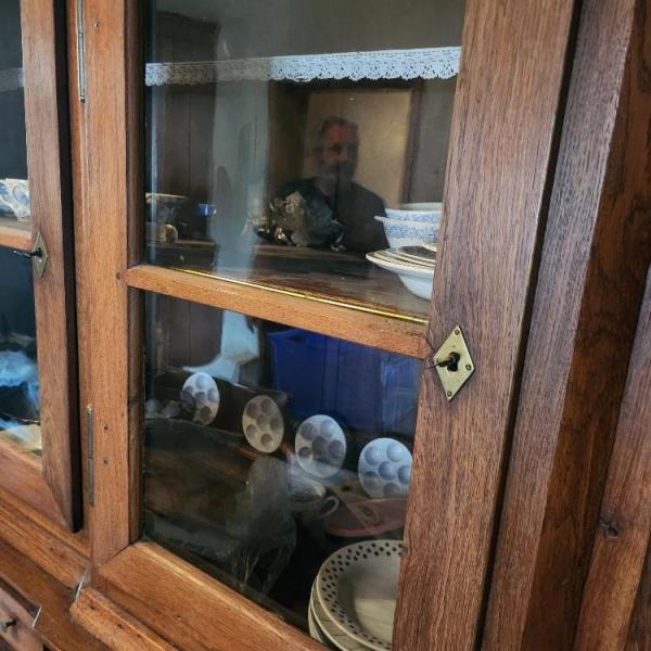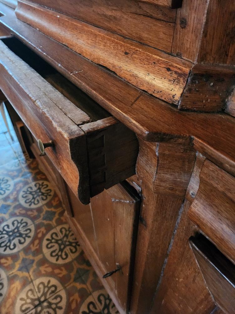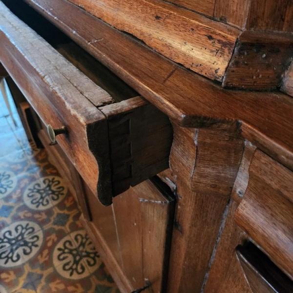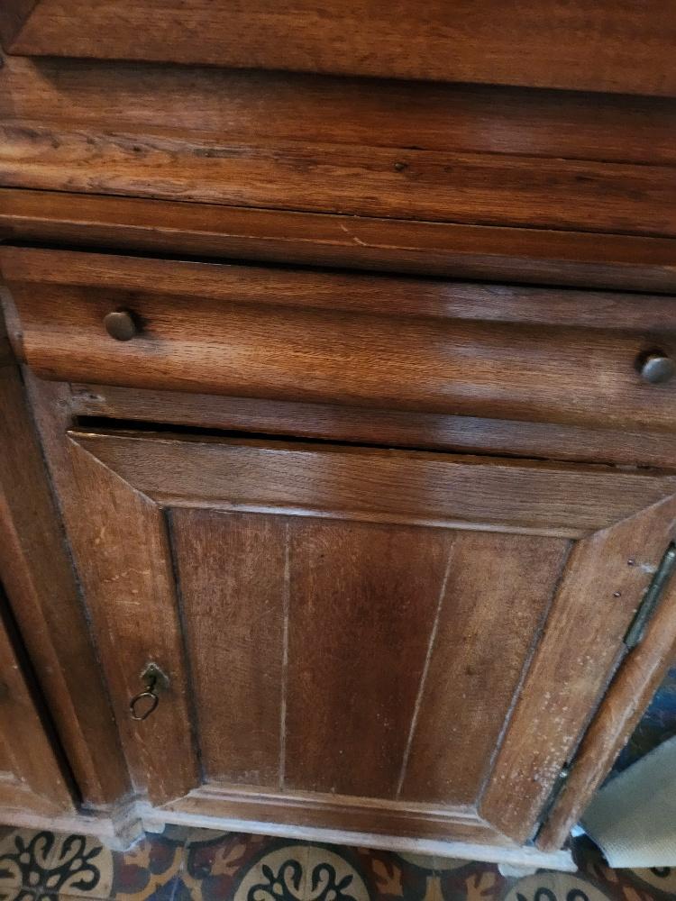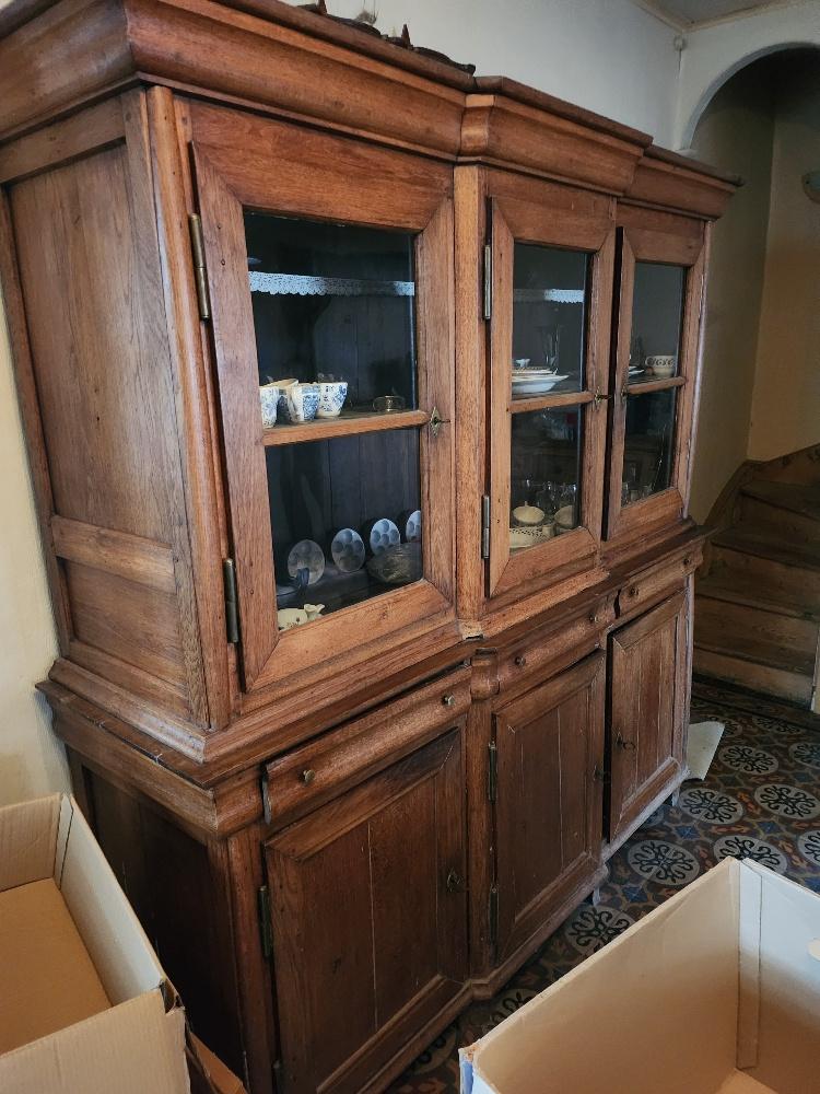 Deux corps en chêne massif Vitrines au dessus (3 portes) Commode en dessous (3 portes) les deux séparées par 3 tiroirs Dimensions : 205 (hauteur)x201x57 cm