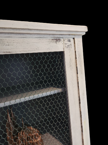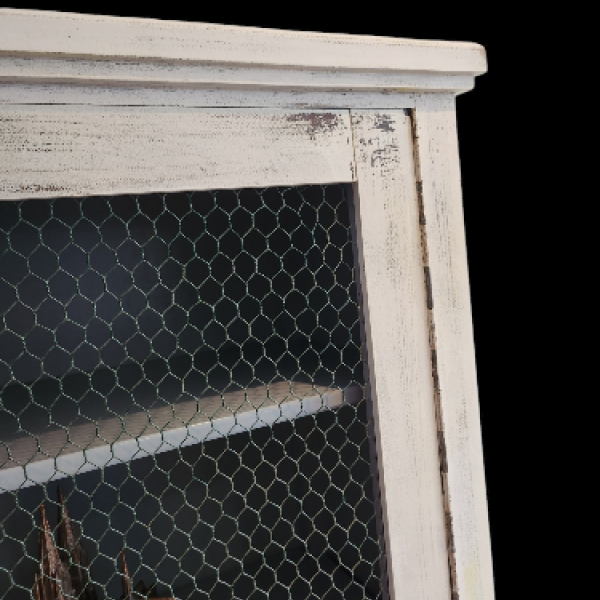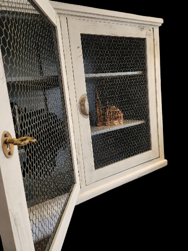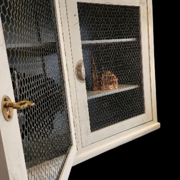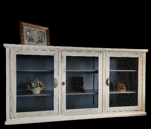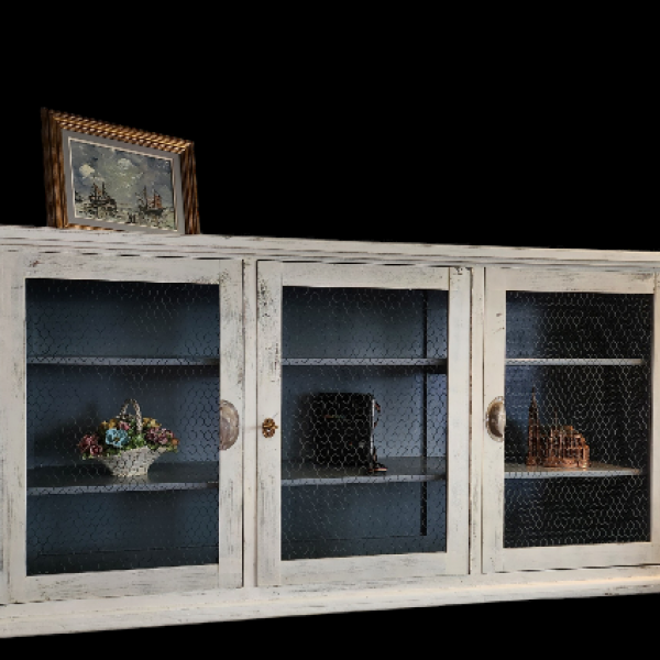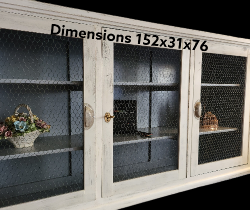 Superbe vitrines à suspendre, remis au goût du jour. 3 portes avec treillis, intérieur gris sur deux étagères. Extérieur, blanc vieilli, deux portes extérieures avec poignée en demi-lune et une clef sur la porte centrale. Dimensions : 152x31x76 (hauteur) cm